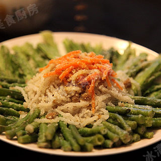 原料:豇豆、白萝卜、茼蒿、胡萝卜丝、大米粉、五香粉、盐。