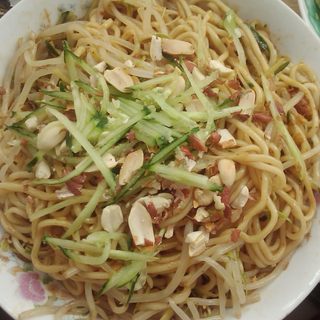 原料:面条、黄瓜、豆芽、碎花生、盐、蚝油。