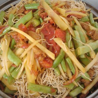 原料:细面条、肉丝、豆角、土豆、西红柿。