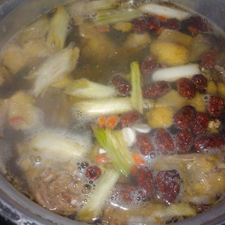 原料:野鸡、八角、葱、姜、红枣、枸杞、淮山。