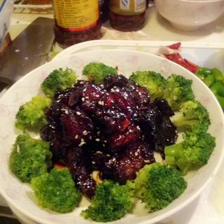 原料:排骨、西兰花、单晶冰糖、陈醋、蒜、香油、盐、八角、花椒、葱、老抽、芝麻、高汤。