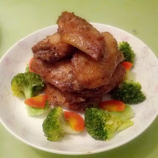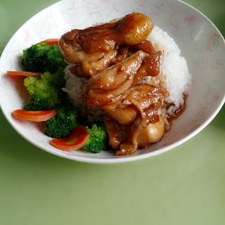原料:鸡腿、米饭、西兰花、胡萝卜、料酒、生抽、老抽、蜂蜜、姜、五香粉、植物油。