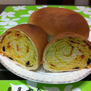 原料:面包粉、全麦粉、绵糖、盐、酵母、温水、葡萄干、枸杞子。