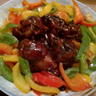 原料:各色彩椒、鸡腿、姜、蒜、生抽、料酒、鸡粉、白糖。