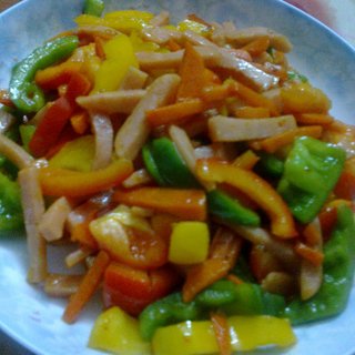 原料:彩椒、火腿肠、胡萝卜、姜、蒜、盐、鸡粉。