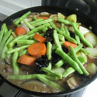 原料:排骨、豆角、胡萝卜、茄子、年糕、土豆、芋头、红薯、白菜、木耳。