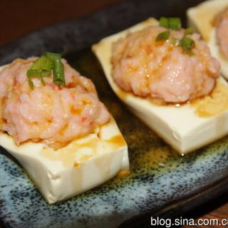 原料:板豆腐、蝦仁、太白粉、蛋白、蔥花、鹽、白砂糖、胡椒粉、香油、香油、柴魚醬油。