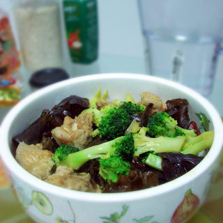 原料:排骨、西兰花、黑木耳、盐、豆粉、酱油。