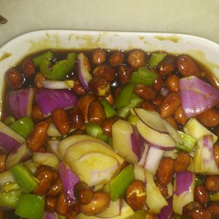 原料:花生米、洋葱、青椒、酱油、食用油、白酒、香醋、盐、味精、白糖。