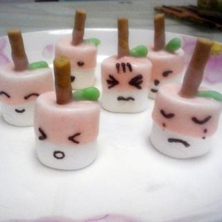 原料:白色方形棉花糖、彩色巧克力、细长条的饼干。