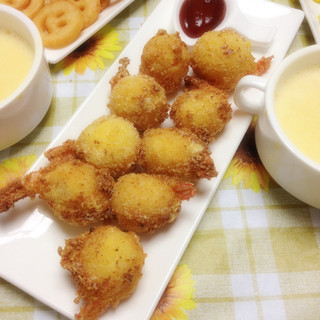 原料:大虾、芝士片、鸡蛋、淀粉、面包糠、油。
