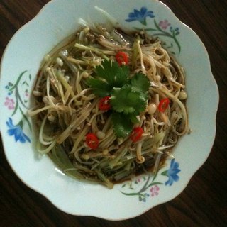 原料:金针菇、葱、芝麻、红辣椒、糖、盐、香醋、油。
