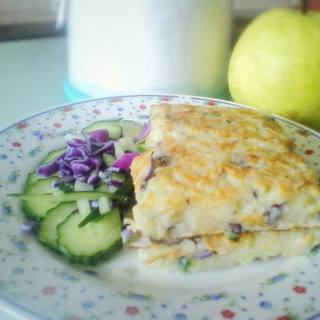 原料:剩米饭、鸡蛋、面粉、紫甘蓝、黄瓜、糖、鸡精、盐。