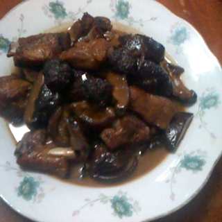 原料:肋排、香菇、杨梅酒、老抽、盐、糖、姜。