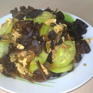 原料:黄瓜、木耳、黄花、鸡蛋、葱、姜、蒜、盐、酱油、鸡精。