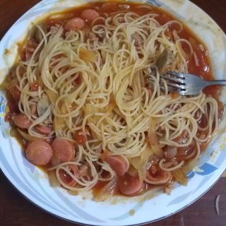 原料:意大利面、西红柿、洋葱、猪肉、热狗、肉丸、番茄汁、意大利面酱、油、盐。