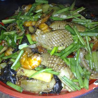 原料:鲜虾、西芹、鱿鱼、土豆、葱姜蒜、小葱、干辣椒、花椒、豆瓣酱、料酒、生抽、糖、盐、鸡精、味精。