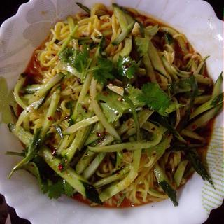 原料:玉米面条、黄瓜、香菜、蒜、糖、米醋、盐、辣椒油、芝麻、芝麻酱、香油。