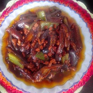 原料:茄子、青椒、瘦猪肉、蒜、姜、盐、味精、鸡精、老抽、酱。