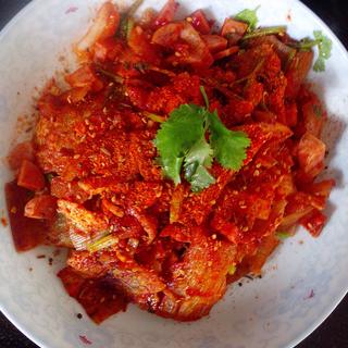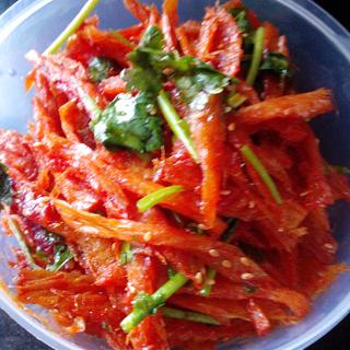 原料:明太鱼、香菜、糖、醋精、盐、熟芝麻、香油、朝鲜族辣椒酱、辣椒油。