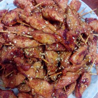 原料:鸡胸脯肉、牙签、奥尔良腌料、味精、鸡精、大喜大牛肉粉、芝麻、烧烤蘸料。