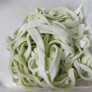 原料:口蘑、香肠、菠菜面、辣椒、自制香辣酱、盐、鸡精、五香粉、生抽。