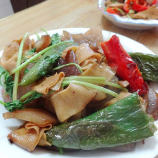 原料:青椒、红椒、猪皮、豆皮、姜、蒜、盐、生抽、鸡精、五香粉。