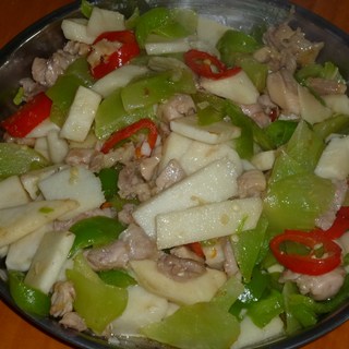 原料:竹笋、莴笋、鸡腿、青椒、红椒、大葱、大蒜、盐、味精。