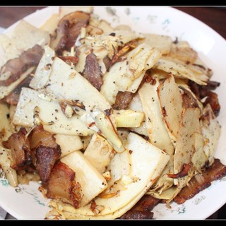 原料:面、胡萝卜、黄花菜、木耳、豆干、肉丁、白菜、香菇、盐、油泼辣子。