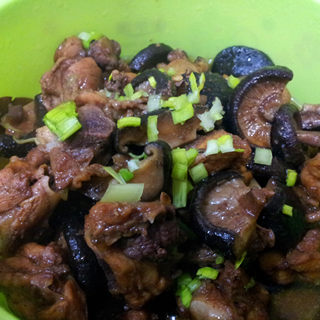 原料:嫩鸡、干香菇、葱、姜、蒜、香叶、八角、盐、老抽、生抽、料酒。