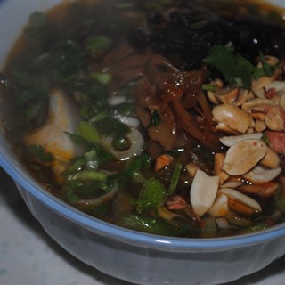 原料:细红薯粉、葱、蒜苗、香菜、香菇、榨菜、焦花生、姜、盐、鸡精、郫县豆瓣酱、山西老陈醋、小磨香油。