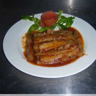 原料:茄子、猪肉、盐、豆瓣酱、泡椒末、鸡精、生粉、食用油、姜蒜、胡椒粉。