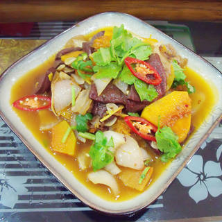 原料:南瓜片、猪血片、洋葱、五花肉片、盐、鸡精、白胡椒粉、老干妈风味豆豉。