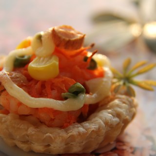 原料:飞饼、鲜虾、胡萝卜、青豆、玉米、杏仁、盐、胡椒粉、沙拉酱。