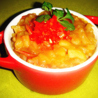 原料:西红柿、马铃薯、红甜椒、盐、老抽、葱花、花椒粉。