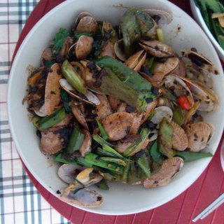 原料:花甲、青椒、红椒、葱、姜、蒜。