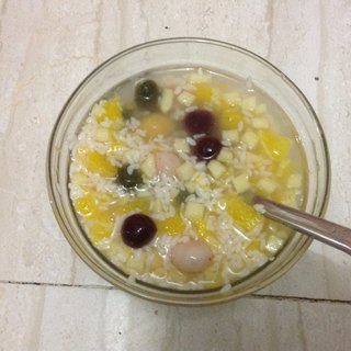 原料:自制醪糟、糯米粉、红曲粉、抹茶粉、橙汁粉、橘子、苹果。