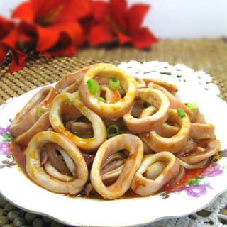 原料:新鲜鱿鱼、洋葱、蒜蓉辣酱、葱姜、盐、味素、食用油。