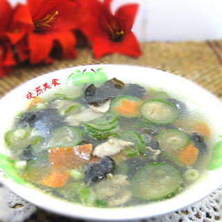 原料:丝瓜、泡发好木耳、胡萝卜、肉、盐、味素、葱、食用油。