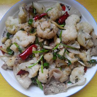 原料:菜花、五花肉、香菜、蒜、生姜、干辣椒、小米辣、食盐、鸡精、料酒、生抽、芝麻、麻油、花椒、孜然粒。