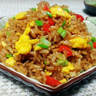 原料:米饭、葱、鸡蛋、酱油、料酒、蚝油、糖、红椒。