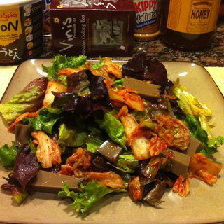 原料:生菜、韩国凉粉、韩国鱼蛋糕、韩国辣白菜、大蒜、韩国辣酱、香油、醋。