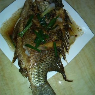 原料:罗非鱼、姜、葱、蒜、生粉、海鲜酱油、鸡精。