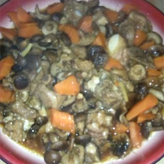原料:排骨、山菇、红萝卜、姜、蒜、生粉、酱油、鸡精。