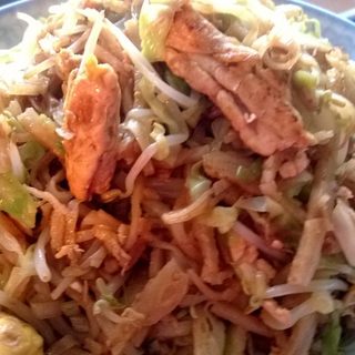 原料:饼丝、绿豆芽、圆白菜、鸡蛋、食盐、酱油、食用油、葱、蒜。