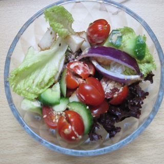 原料:生菜、樱桃番茄、荷兰小黄瓜、洋葱、芝麻、千岛沙拉酱、胡椒粉、芥末油、辣椒粉、生抽、寿司醋或者米醋。