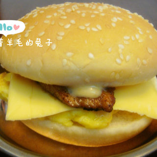 原料:汉堡面包、鸡蛋、猪排、芝士、千岛酱、盐、酱油、白糖、烧烤汁、生粉。