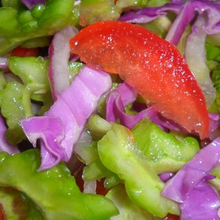 原料:苦瓜、洋葱、黄瓜、西红柿、紫甘蓝、盐、白糖、胡椒粉、米醋、香油。