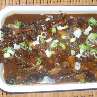 原料:罗非鱼、盐、白糖、料酒、老抽、醋、葱、姜、蒜、干辣椒、大料、开水。