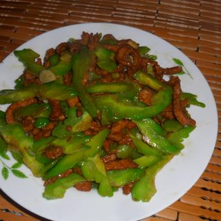 原料:苦瓜、猪瘦肉、葱、姜、蒜、老抽、料酒、淀粉、盐、白糖。